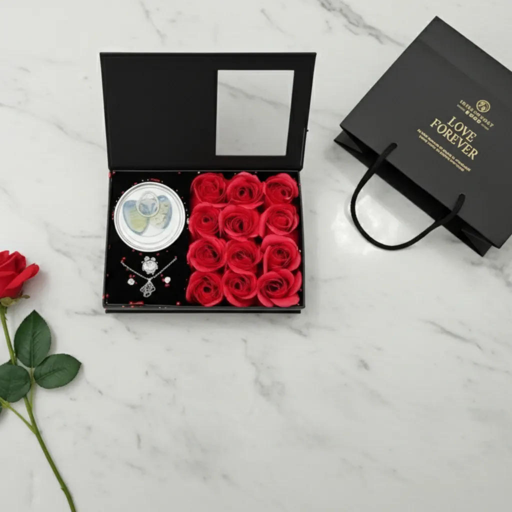 সাথে ১২টি লাল গোলাপ থাকবে (যা সাবান হিসেবেও ব্যবহার করা যাবে)